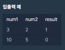 num1를 num2로 나눈 나머지를 return 하도록 solution 함수를 완성해주세요.